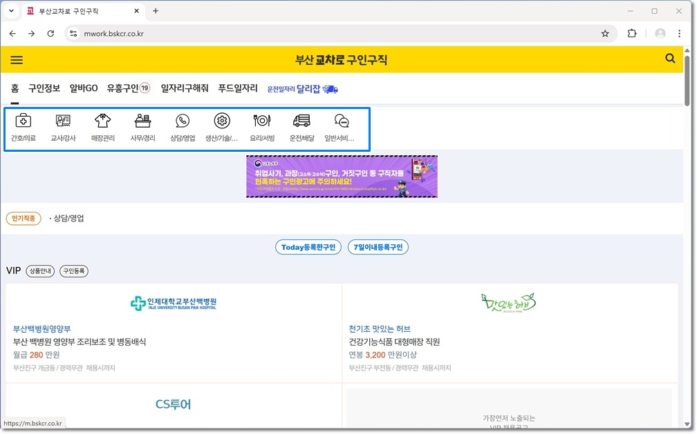 부산교차로 구인구직 사이트는 포털사이트 검색을 통해 쉽게 접속할 수 있습니다. 검색창에 ‘부산교차로’를 입력하거나, 아래에 있는 바로가기 링크를 이용하시면 보다 빠르게 이동할 수 있습니다.