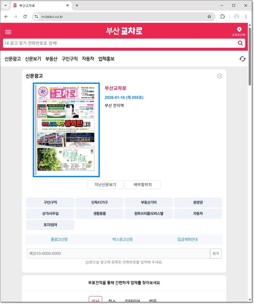 - 홈 화면에 있는 부산 교차로 신문 이미지를 클릭