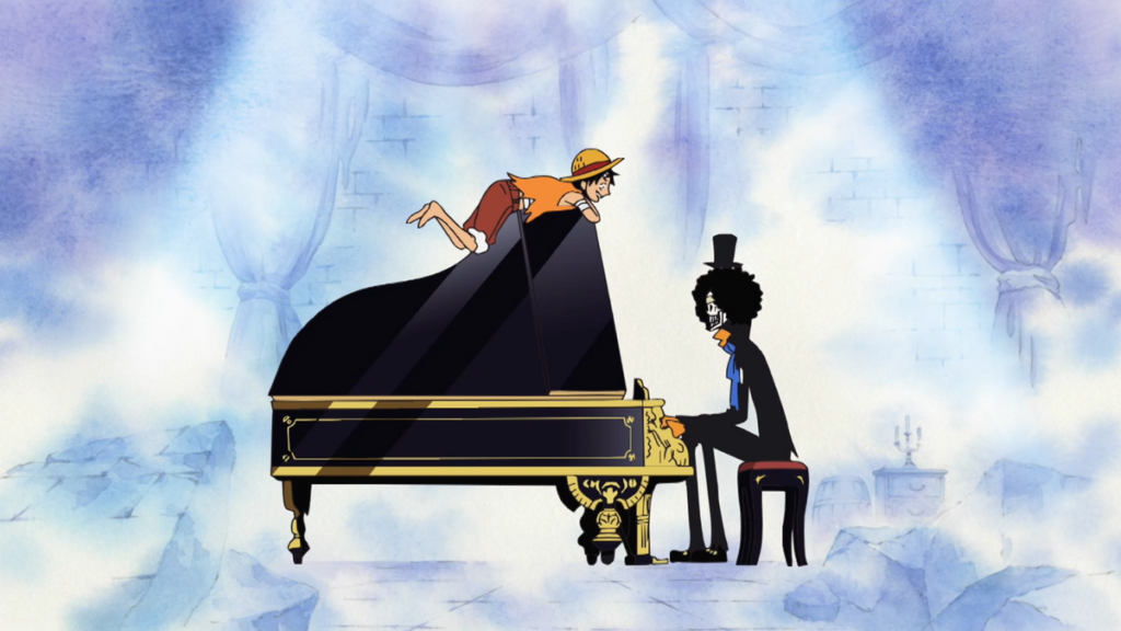 어인섬을 향해 항해 중이던 밀짚모자 일행은 짙은 안개 속에서 정체불명의 ‘고스트 선’을 만나고, 그 안에는 해골 모습의 신비한 남자, 브룩이 타고 있었다. 그는 과거 ‘콧노래의 브룩’이라 불리던 해적이며, 한 차례 죽은 후 ‘부활부활 열매’의 힘으로 부활한 ‘부활 인간’이었다.