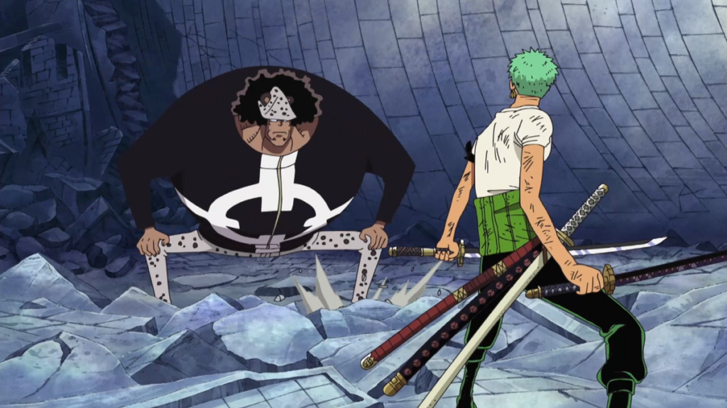 하지만 진짜 위기는 그 직후 찾아온다. 또 다른 칠무해 ‘바솔로뮤 쿠마’가 등장, 세계정부의 명령으로 섬에 남은 전원 말살을 선언한다. 루피는 기절한 상태이고, 쿠마는 그의 목숨과 전원 사망을 맞바꾸자고 제안한다. 누구도 포기하지 않자, 조로는 모두를 살리기 위해 자기 목숨과 바꾸자며 스스로 희생을 자청한다. 쿠마는 조건으로 ‘루피가 받은 모든 고통을 조로가 대신 받을 것’을 제안하고, 조로는 이를 받아들인다. 죽을 듯한 고통을 견뎌낸 조로는 끝내 의식을 잃고도 쓰러지지 않으며, 이를 본 쿠마는 조용히 섬을 떠난다.
