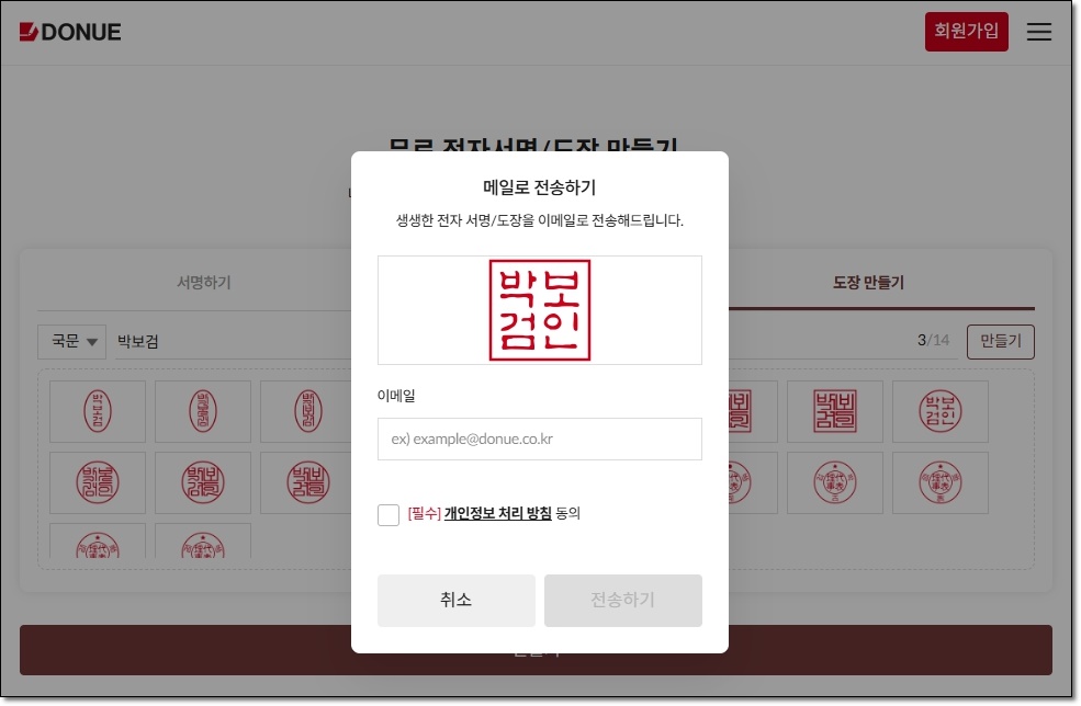 완성된 전자도장은 이메일로 받을 수 있습니다. 이메일 주소를 입력하고 개인정보 처리 방침에 동의한 뒤 [전송하기] 버튼을 누르면 됩니다.