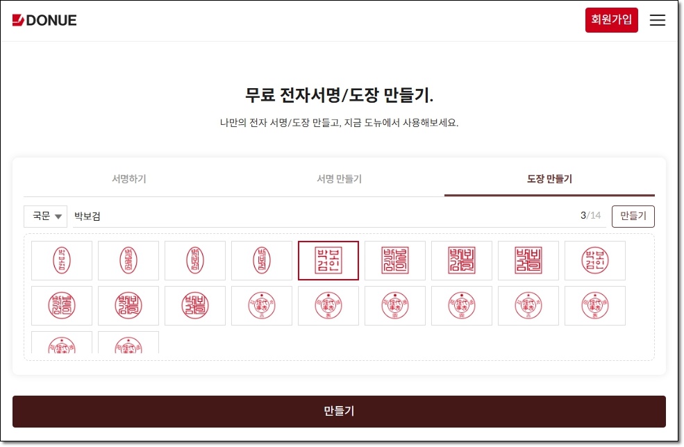 그러면 다양한 도장이 화면에 표시되는데 이 중에서 원하는 디자인을 선택한 다음 하단에 있는 [만들기] 버튼을 누르면 됩니다.