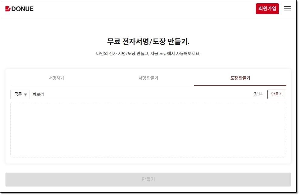 먼저 ‘도장 만들기’ 서비스에서 국문 또는 한자를 선택한 뒤 이름을 입력하고 [만들기]를 누릅니다.